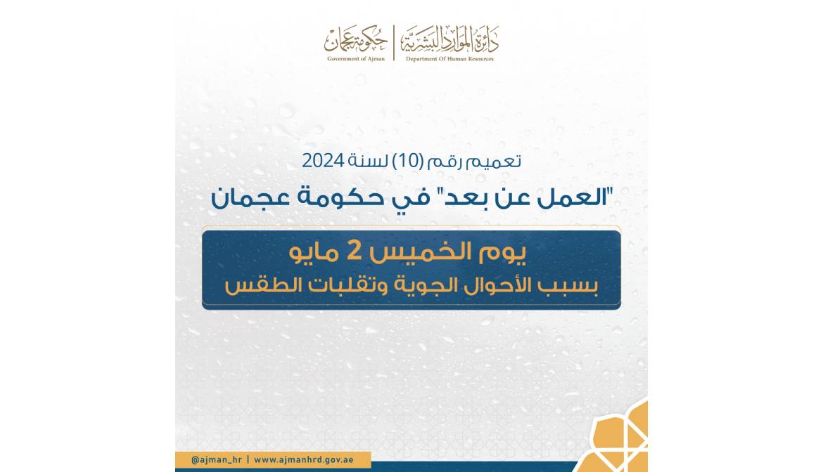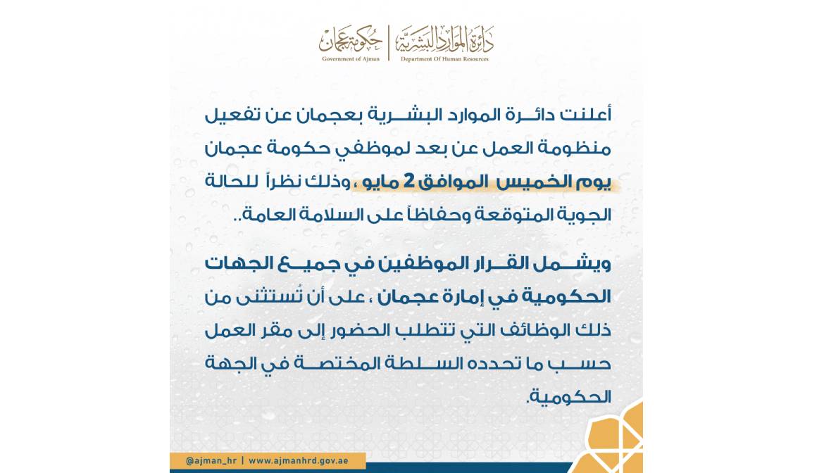 أعلنت دائرة الموارد البشرية بعجمان عن تفعيل منظومة العمل عن بعد لموظفي حكومة عجمان يوم الخميس الموافق 2 مايو، وذلك نظراً للحالة الجوية المتوقعة وحفاظاً على السلامة العامة..