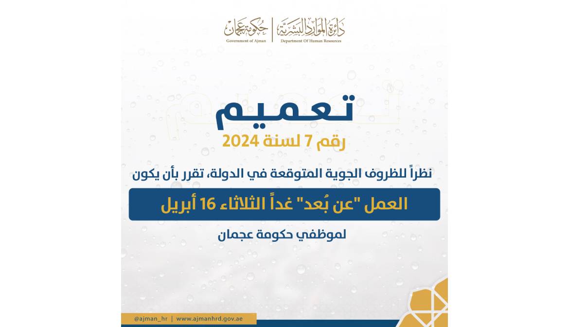 وجه سمو الشيخ عمار بن حميد النعيمي ولي عهد عجمان رئيس المجلس التنفيذي بأن يكون العمل يوم الثلاثاء الموافق 16 أبريل عن بُعد، لموظفي حكومة عجمان، نظراً لظروف وتقلبات الطقس. ويشمل القرار الموظفين في جميع الجهات الحكومية في إمارة عجمان ، على أن تُستثنى من ذلك الوظائف التي تتطلب الحضور إلى مقر العمل حسب ما تحدده السلطة المختصة في الجهة الحكومية.