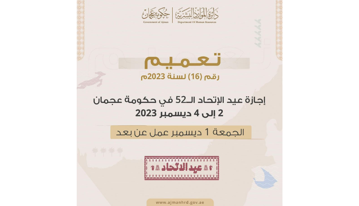 دائرة الموارد البشرية لحكومة عجمان: عطلة عيد الاتحاد للجهات الحكومية من 2 إلى 4 ديسمبر
