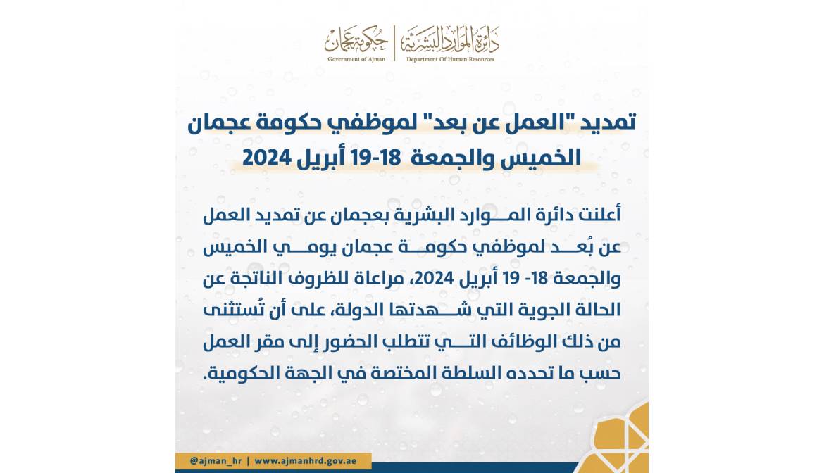 ‏أعلنت دائرة الموارد البشرية بعجمان عن تمديد العمل عن بُعد لموظفي حكومة عجمان يومي الخميس والجمعة 18- 19 أبريل 2024، مراعاة للظروف الناتجة عن الحالة الجوية التي شهدتها الدولة، على أن تُستثنى من ذلك الوظائف التي تتطلب الحضور إلى مقر العمل حسب ما تحدده السلطة