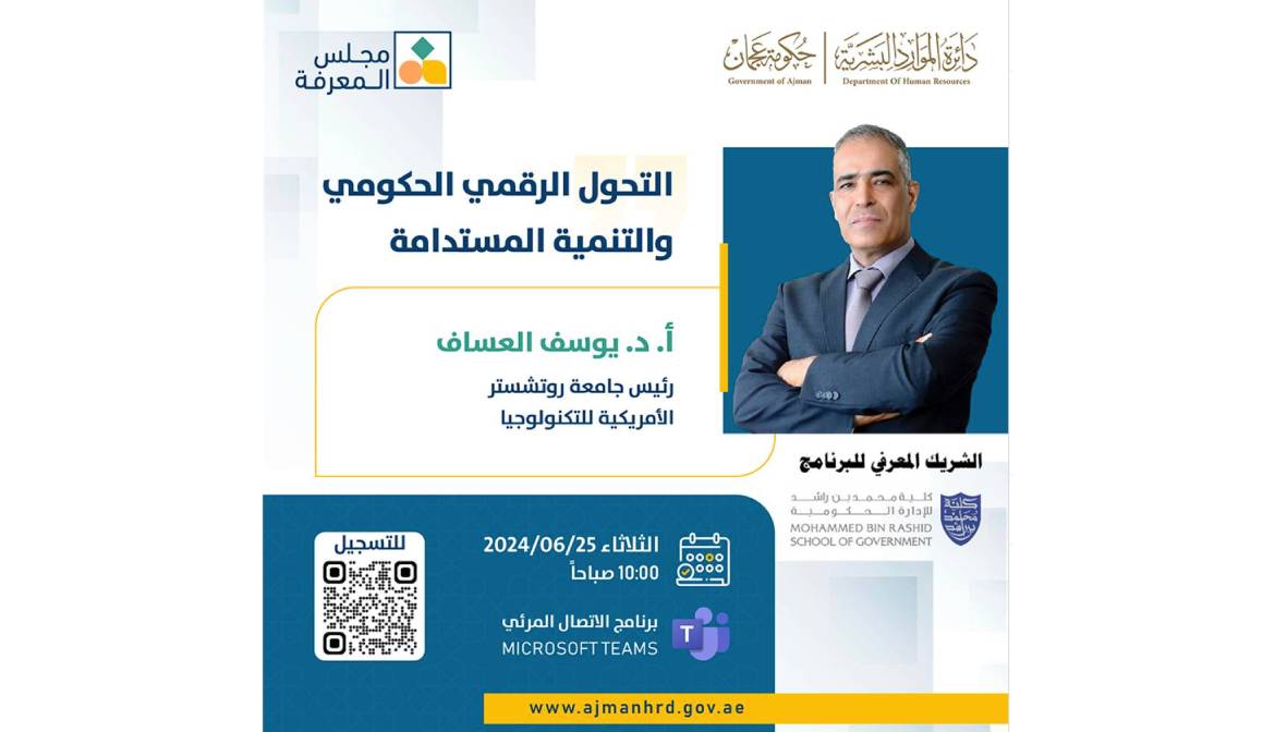 عجمان: 24/06/2024 تنظم دائرة الموارد البشرية في حكومة عجمان جلسة مجلس المعرفة بعنوان (التحول الرقمي الحكومي والتنمية المستدامة)، تستضيف خلالها الأستاذ الدكتور/ يوسف العساف رئيس جامعة روتشستر الأمريكية للتكنولوجيا، و ذلك غداً (الثلاثاء) عبر برنامج الاتصال المرئي و بالتنسيق مع الشريك المعرفي كلية محمد بن راشد للإدارة الحكومية.