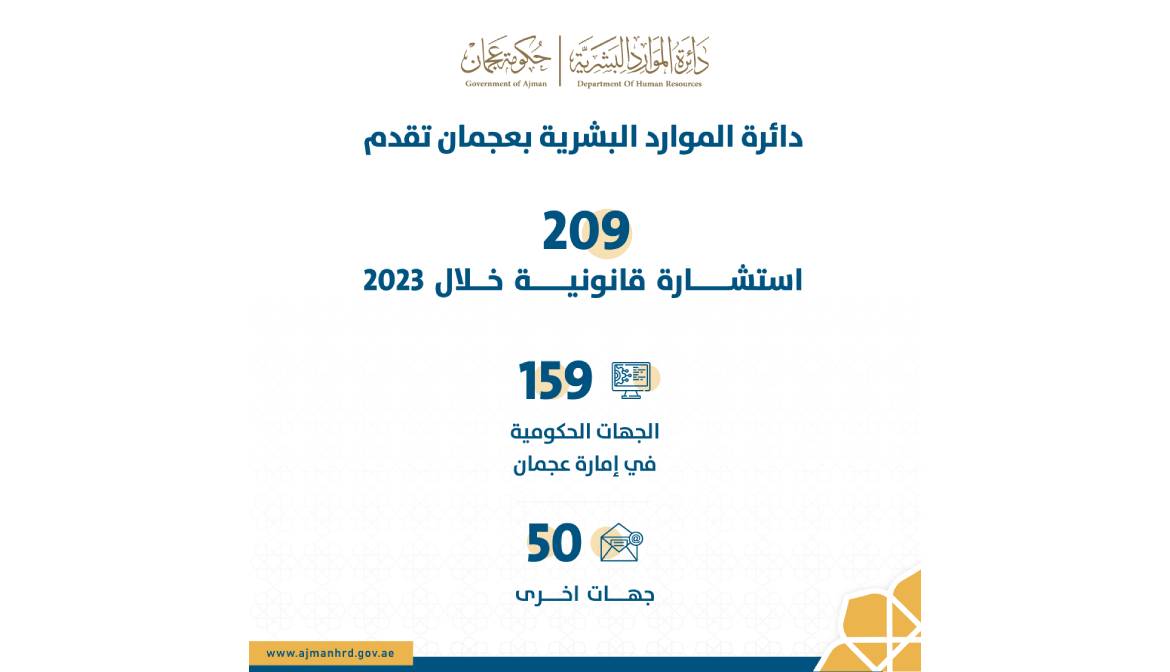عجمان : 19-2-2024 استقبلت دائرة الموارد البشرية في حكومة عجمان 209 استفساراً قانونياً خلال عام 2023م حول سياسات وتشريعات وقوانين الموارد البشرية المطبقة في حكومة عجمان، وذلك عبر القنوات المخصصة للرد على الاستفسارات في الدائرة.