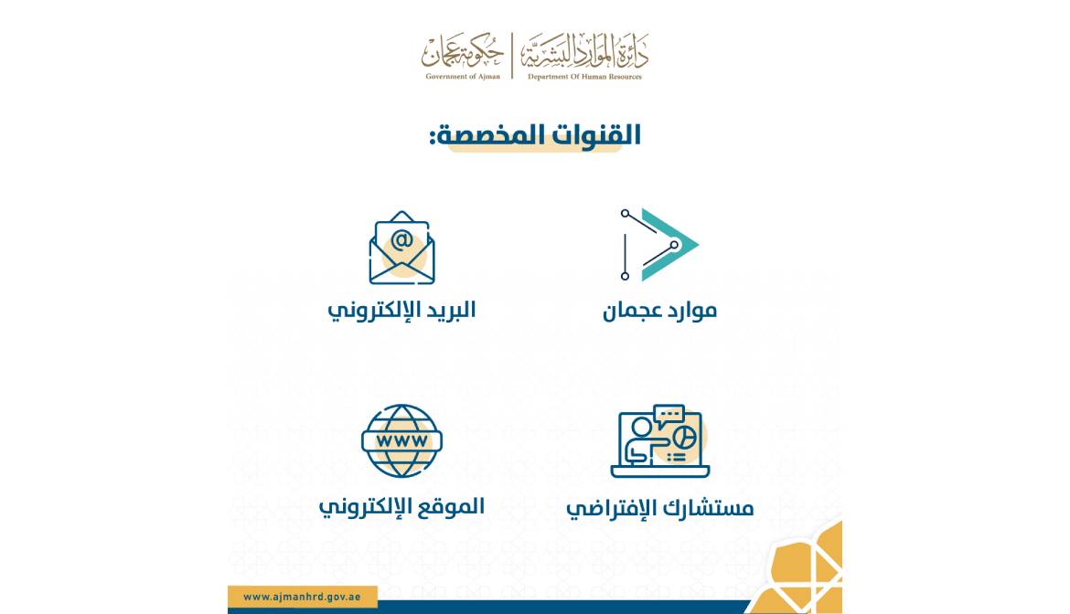 وتعمل دائرة الموارد البشرية في حكومة عجمان على تطوير قنوات التواصل ما بين الدائرة والعاملين في حكومة عجمان بهدف التعريف بكافة تفاصيل الإجراءات القانونية الخاصة بقانون الموارد البشرية و لائحته التنفيذية.