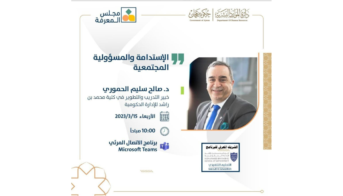 تزامناً مع “عام الاستدامة” في دولة الإمارات العربية المتحدة،تنظم دائرة الموارد البشرية بعجمان جلسة مجلس المعرفة بعنوان ” الاستدامة والمسؤولية المجتمعية” للمحاضر الدكتور صالح سليم الحموري الخبير في التدريب والتطوير بكلية محمد بن راشد للإدارة الحكومية وذلك يوم غد الأربعاء عبر برنامج الاتصال المرئي.