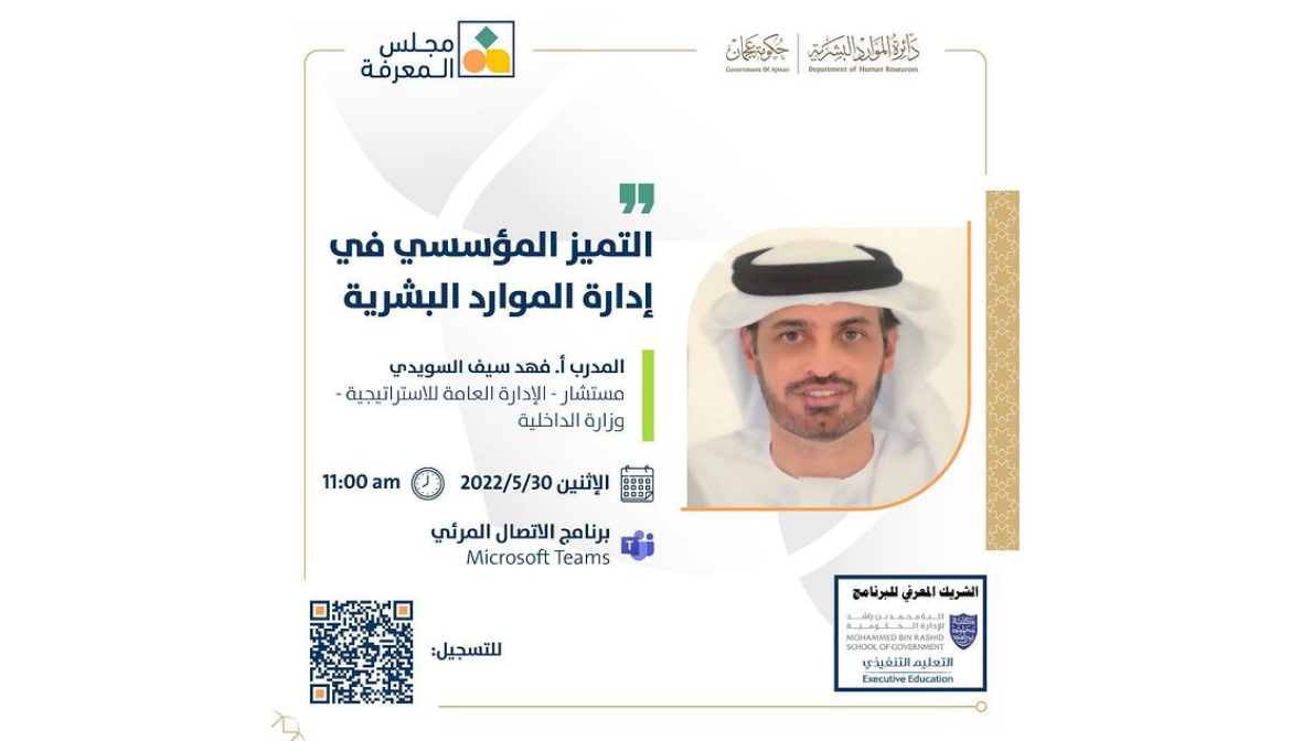 تنظم دائرة الموارد البشرية لحكومة عجمان الجلسة الثانية من مجلس المعرفة بعنوان ” التميز المؤسسي في إدارة الموارد البشرية” بمشاركة المحاضر الأستاذ فهد سيف السويدي-مستشار الإدارة العامة للاستراتيجية في وزارة الداخلية وذلك يوم الاثنين المقبل عبر برنامج الاتصال المرئي.