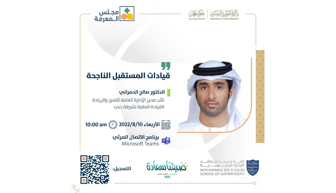 تنظم دائرة الموارد البشرية بعجمان جلسة مجلس المعرفة بعنوان ” قيادات المستقبل الناجحة ” للمحاضر العميد الدكتور صالح الحمراني نائب مدير الإدارة العامة للتميز والريادة في القيادة العامة لشرطة دبي وذلك ضمن مبادرات النسخة الثالثة من البرنامج الصيفي لحكومة عجمان «صيفنا سعادة» وذلك يوم الأربعاء الموافق 10 أغسطس 2022 عبر برنامج الاتصال المرئي.
