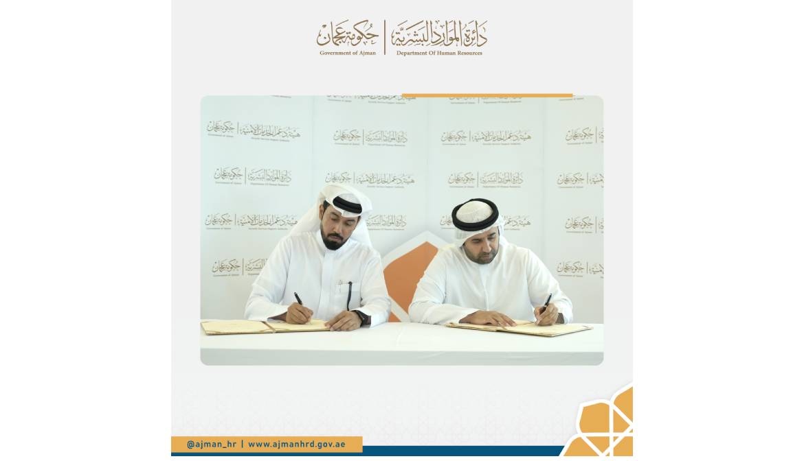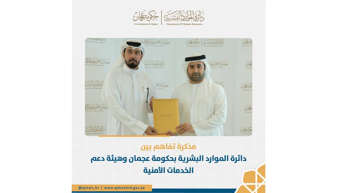 عجمان : 4-3-2024 وقعت دائرة الموارد البشرية بحكومة عجمان وهيئة دعم الخدمات الأمنية مذكرة تفاهم بهدف تعزيز التعاون المشترك بين الطرفين من خلال تقديم الدعم الفني والاستشاري وتحديث وتطوير التشريعات والقرارات المتعلقة بأنظمة الموارد البشرية وفي مجالات التدريب والتطوير وتبادل المعلومات.