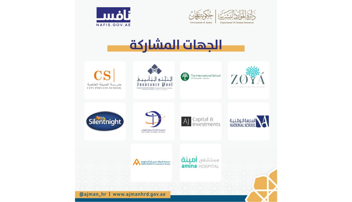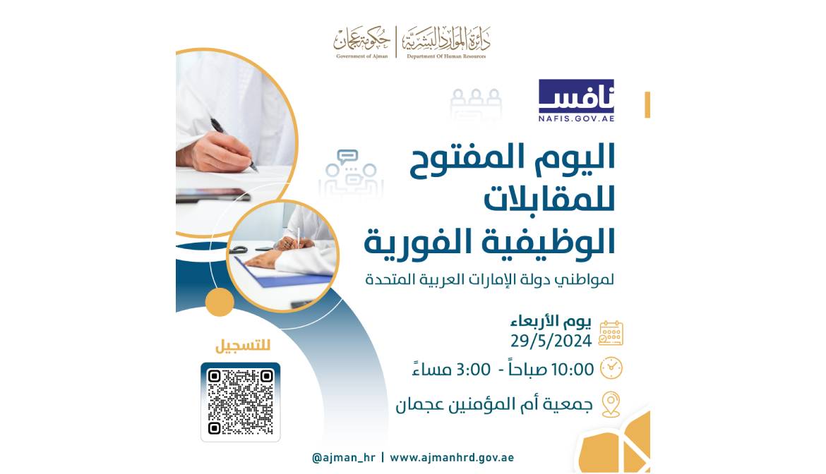 عجمان :27/5/2024 تنظم دائرة الموارد البشرية في حكومة عجمان بالتعاون مع وزارة الموارد البشرية والتوطين و مجلس تنافسية الكوادر الإماراتية (نافس)، يوماً مفتوحاً للمقابلات الوظيفية الفورية يوم الأربعاء المقبل وذلك في جمعية أم المؤمنين بعجمان وبمشاركة 10 شركات من القطاع الخاص.