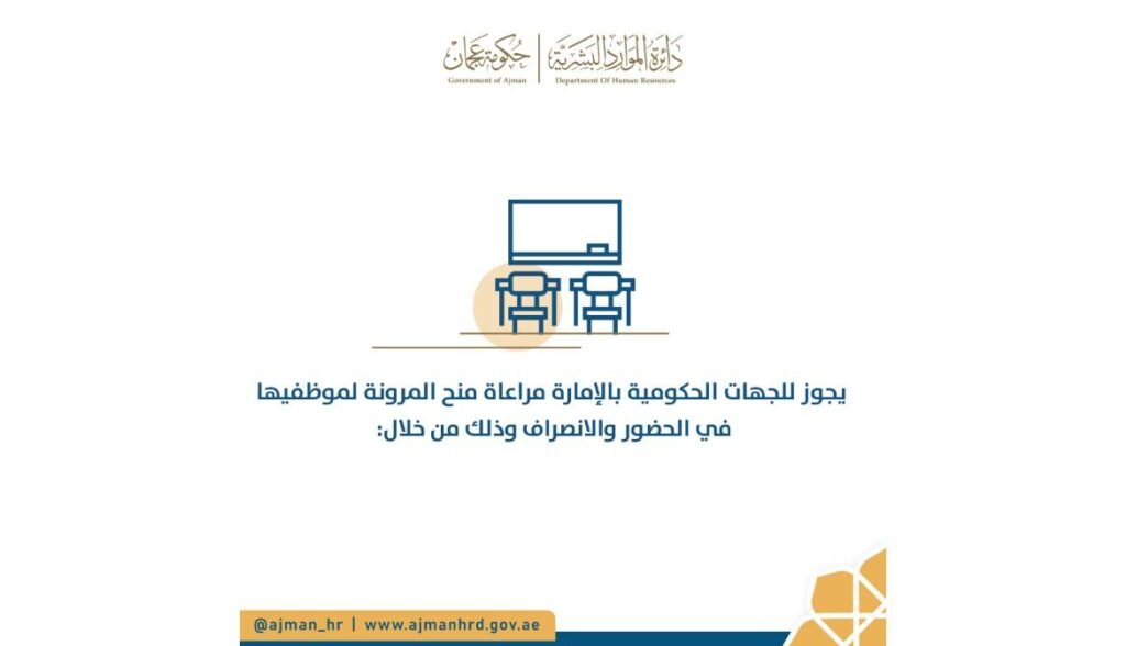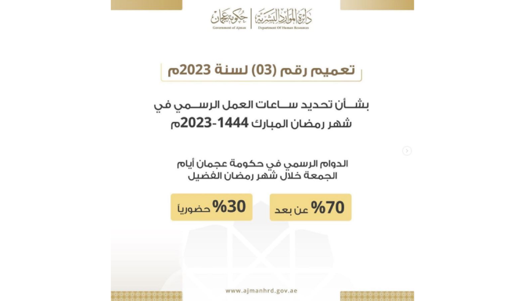 دائرة الموارد البشرية لحكومة عجمان دوام الجهات الحكومية في إمارة عجمان أيام الجمعة في شهر رمضان عن بُعد بنسبة 70% وحضورياً بنسبة 30%.