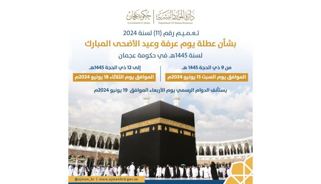 دائرة الموارد البشرية بعجمان تحدد عطلة يوم عرفة و عيد الأضحى المبارك
