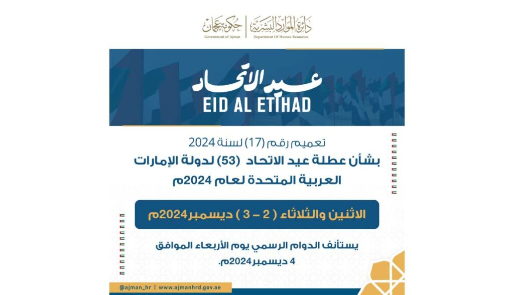 دائرة الموارد البشرية تعلن عطلة عيد الاتحاد للجهات الحكومية في إمارة عجمان