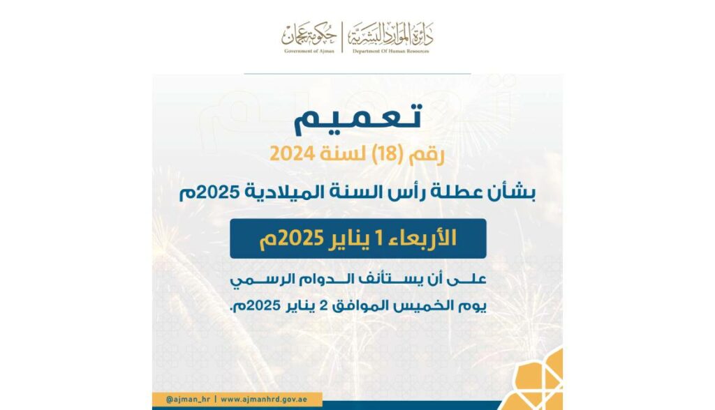 دائرة الموارد البشرية : الأربعاء 1 يناير عطلة رأس السنة الميلادية في حكومة عجمان